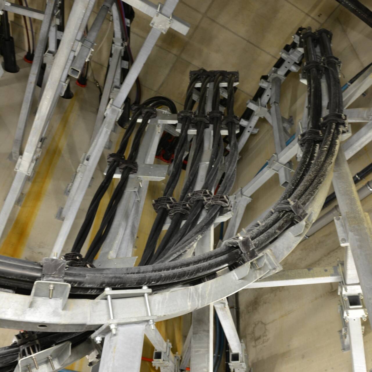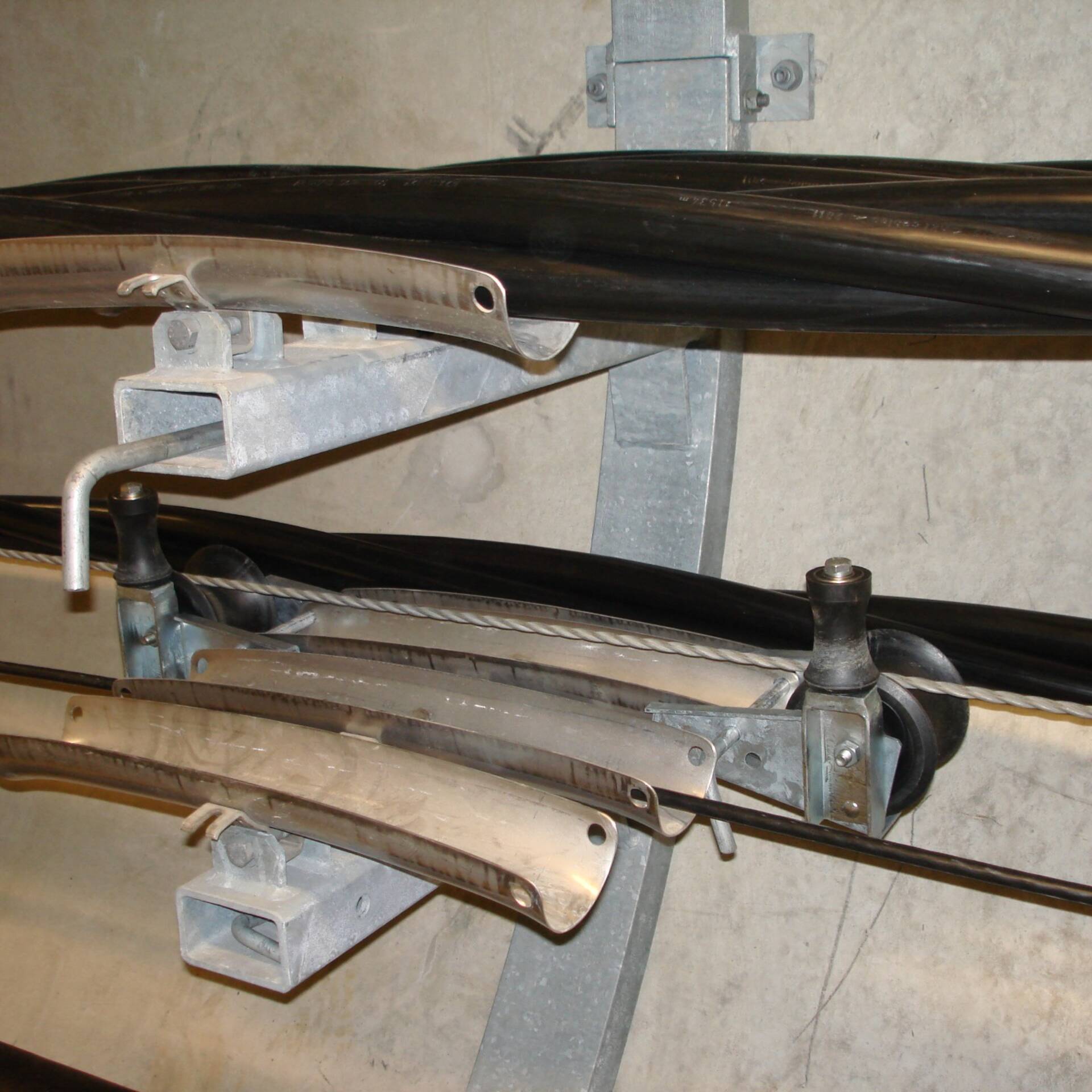 There are various saddle shells and attachment systems for the cable arrangements. Special saddle shells with reinforced attachment points are used for step routes. Cable bunches can be attached in a narrow triangle in the cable saddles as well in addition to a simple routed cable. The cable diameters are usually at 30 - 165 mm. Ask us if you need any other dimensions. Of course, we will design and deliver the wall brackets and further accessories, such as fall rollers, assembly rollers, booms, clamping bands, rubber inserts, etc. as well. We will gladly detail the project with you.