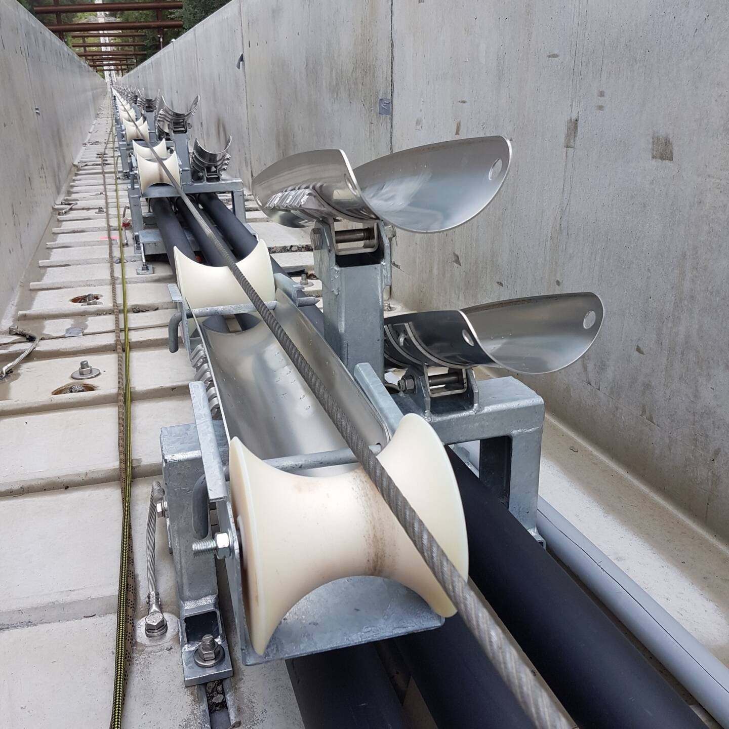 The cable rolls through the attachment system on «ball bearings» with a low friction resistance across long distances of approx. 500 – 1000 m, depending on cable size. This leads to very low pulling forces. The saddle distance is, depending on the properties and diameters of the cable, up to 7.2 meters. After insertion, the cable is placed in its final position in the anti-magnetic cable saddles. Only the sag will still be regulated after this.