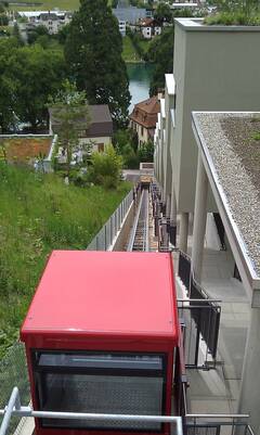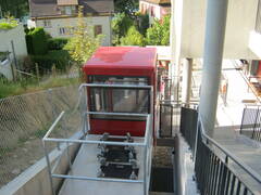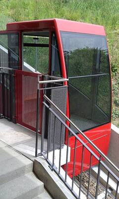 This system is special because it has an additional tractor unit that parks at the upper end of the route and can be coupled to the vehicle if required. The elevator then moves at a reduced speed and must be called by key switch at the stations.