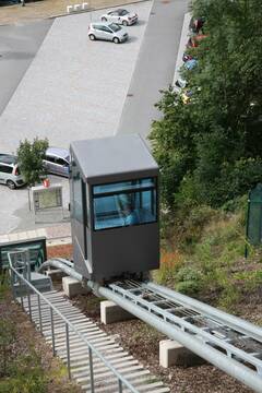 The system is equipped with a hydraulic incline balancer. In particular the downwards ride is an enjoyable experience, with the elevator moving down across the bend while the cabin remains nice and horizontal at all times. The old town is not car-free but there are limited parking spaces. The valley station has a large parking place and the elevator makes the "climb" easy now.