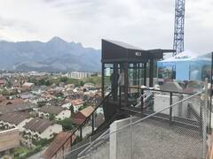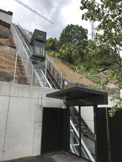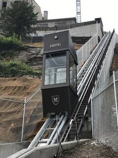 The «UPTOWN MELS» development can be found at the old Stoffel site above Mels. The former textile factories were converted into an urban residential and commercial area with 220 apartments. There was only a narrow road without pedestrian protection led up to the industrial sector. Due to the extreme slope, rebuilding the road was too expensive, so property owners and the local council decided on a link with our Comfort inclined elevator. Since 2019 it has linked the village of Mels with the new settlement. This convenient system travels 48.5m and covers a height of 31 metres. The 37 kW drive handles the gradient of 39.9° at a speed of 1.5 m/s. The stations at the top and bottom are equipped with automatic doors. The cabin holds 12 people whilst the payload is 900kg.