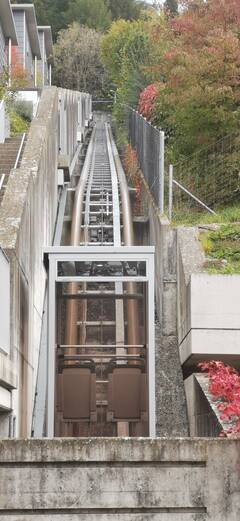 Seit 15 Jahren erschliesst unsere Comfortanlage eine Überbauung mit einzelnen Häusern im Lindliberg in Schaffhausen. Auf der fast 50 m langen Strecke mit Neigungsunterschied werden fünf Stationen angefahren. 2022 haben wir die Anlage erneuert und optimiert. Sie erhielt eine komplett neue Steuerung und Verkabelung. Auch der Neigungsausgleich wurde mit einer neuen Steuerung ergänzt. Die neuen Steuerungen sind alle über Cloud von jedem Standort aus zu erreichen und zu kontrollieren.