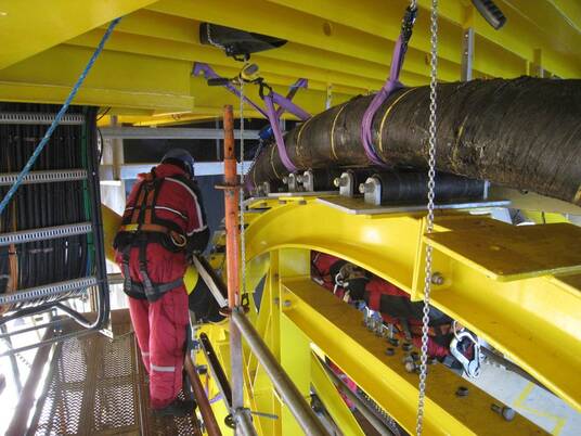 The cable rolls through the attachment system on «ball bearings» with a low friction resistance across long distances of approx. 500 – 1000 m, depending on cable size. This leads to very low pulling forces. The saddle distance is, depending on the properties and diameters of the cable, up to 7.2 meters. After insertion, the cable is placed in its final position in the anti-magnetic cable saddles. Only the sag will still be regulated after this.