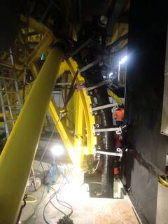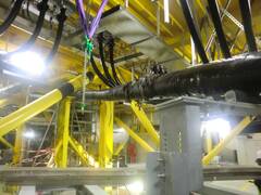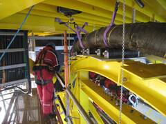 The three-conductor cable with integrated fiberglass had to be pulled up vertically 30 meters. The special roller bend and high-strength box rollers pulled the cable to the end closures. A grid platform serves as a sufficiently long reserve loop.